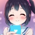 学校内で頬を赤らめて携帯電話をチェックしている若い学生の画像。画像の周りにハートが描かれており、アニメ風である。